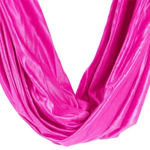 Unsere Hängematten bestehen aus hochwertigem Polyamid (auch Nylon genannt). Der Stoff fühlt sich angenehm an, ist ausreichend dick und schön gefärbt. Es hält einer statischen Belastung von bis zu 1200 kg und einer dynamischen Belastung von 150 kg stand. Das bedeutet, dass er von zwei Personen mit einem Gesamtgewicht von 150 kg sicher genutzt werden kann. Unsere Aerial-Yoga-Hängematten haben im Vergleich zu Seide eine etwas größere Querdehnung – ab einer Breite von ca. 280 cm können die Hängematten bis zu 300 cm ausgezogen werden. Nach einer Sitzung oder einem Training können Sie ganz einfach hineinschlüpfen und Ihr Savasana ohne Ablenkungen genießen. Darüber hinaus sind Aerial-Yoga-Hängematten in der Länge nicht dehnbar, sodass sie Ihrem Körper eine stabile Unterstützung bieten.